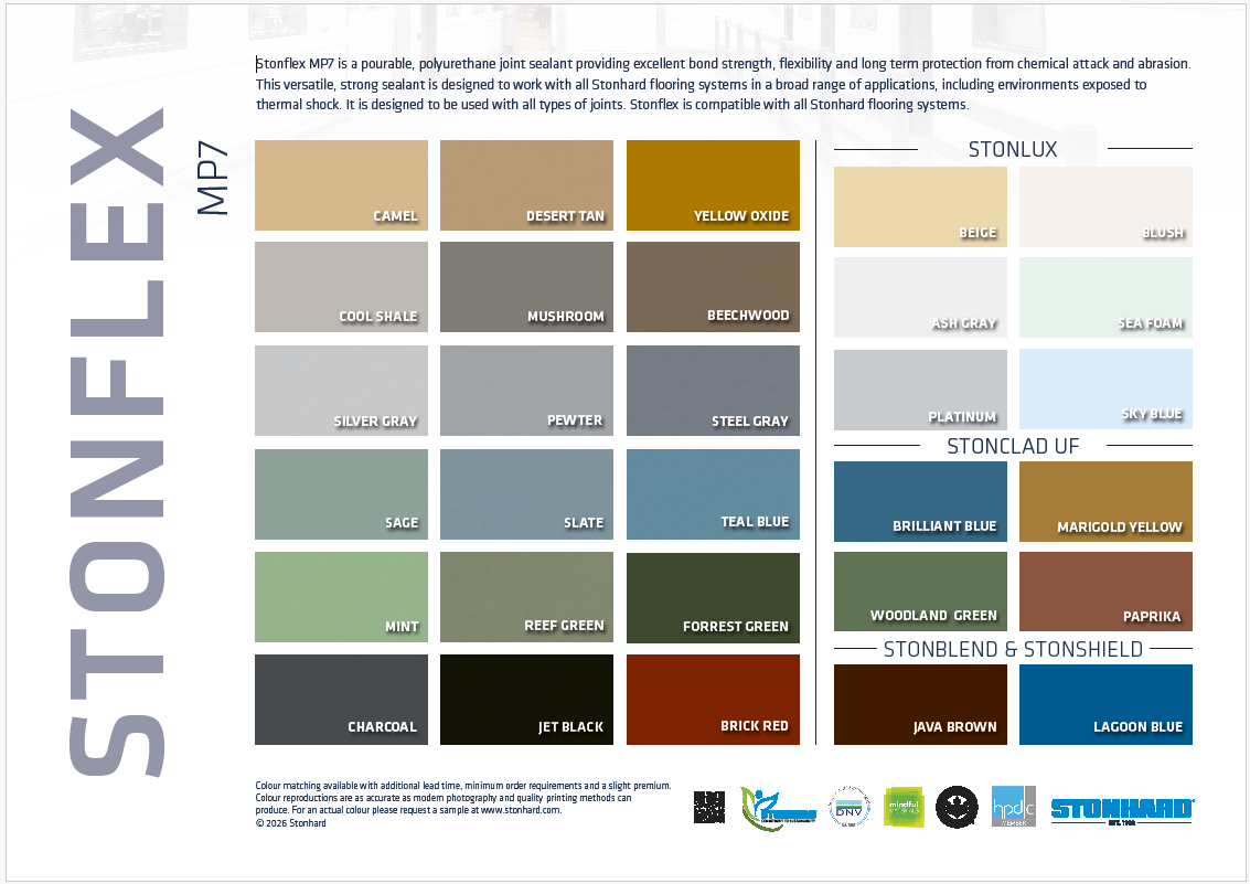 Stonhard zapewnia szeroką paletę kolorów standardowych, począwszy od chłodnych i czystych błękitów oraz szarości, aż do ciepłych odcieni brązów i czerwieni w śmiałych kombinacjach, także z teksturą, które ożywiają pomieszczenia przemysłowe i handlowe. Matowe, błyszczące, z wzorami lub gładkie. Zapytaj o niestandardowe palety kolorystyczne, specjalnie dostosowane mieszanki oraz niestandardowe rysunki i loga.
